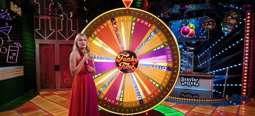 Funky Time est une grande roue live réalisée par DigiWheel, à l’esthétique disco et aux couleurs flashy. Avec 64 segments, elle figure parmi les roues les plus fournies du catalogue Evolution, par le nombre et la diversité des sections. On y retrouve 28 segments « 1 » (paiements de 1 à 50:1), 24 segments « lettre » (de 25 à 1 250:1) et 12 segments Bonus qui déclenchent les jeux bonus (Bar, Stayin’ Alive, Disco et VIP Disco). Chaque bonus offre des gains variables, avec un plafond théorique pouvant atteindre 10 000 fois la mise.